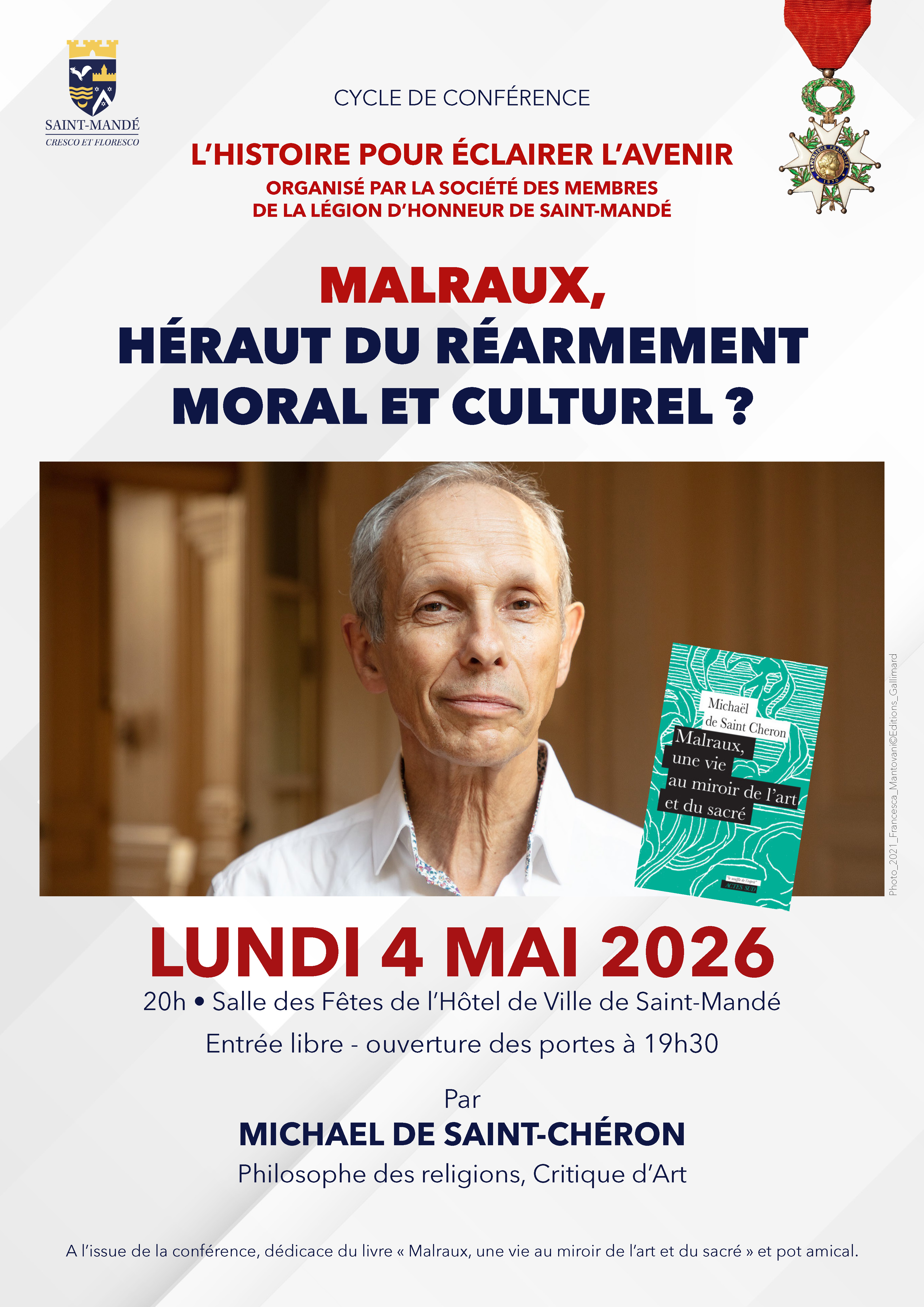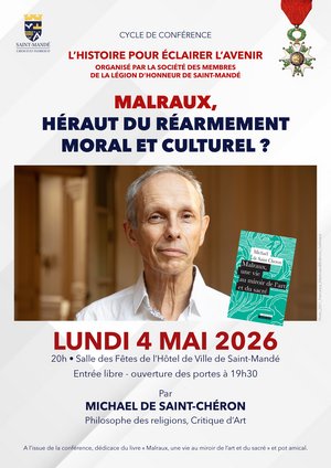 Dans le cadre de son cycle de conférences “L’histoire pour éclairer l’avenir”, la Société des Membres de la Légion d’Honneur de Saint-Mandé a convié Michaël de Saint-Chéron pour son livre Malraux, une vie au miroir de l’art et du sacré.
