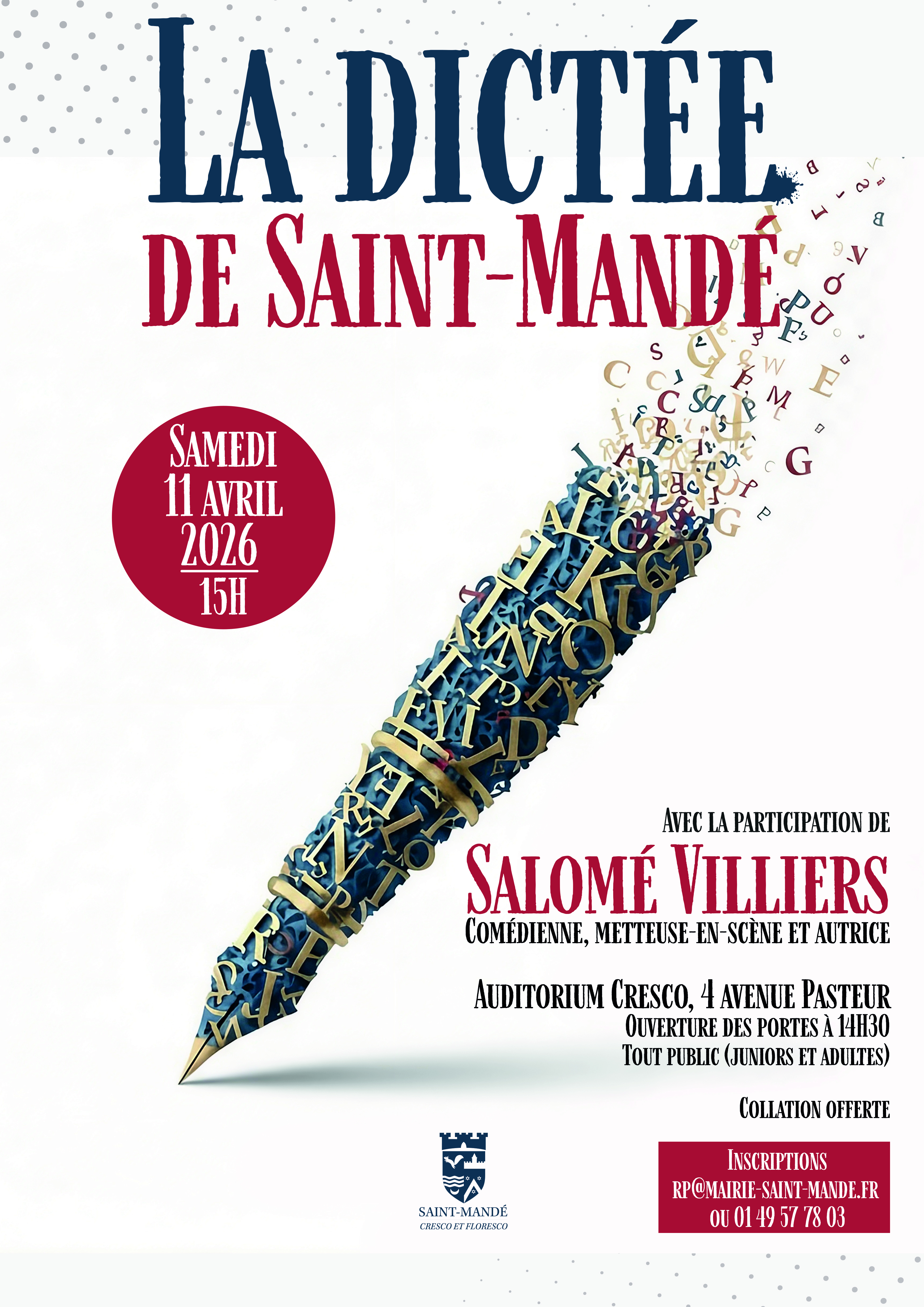 Partenaire de l’édition 2026 de La Semaine de la langue française et de la Francophonie, Saint-Mandé organise sa “Dictée” avec l’aimable participation, cette année, de Salomé Villiers pour la lecture du texte.