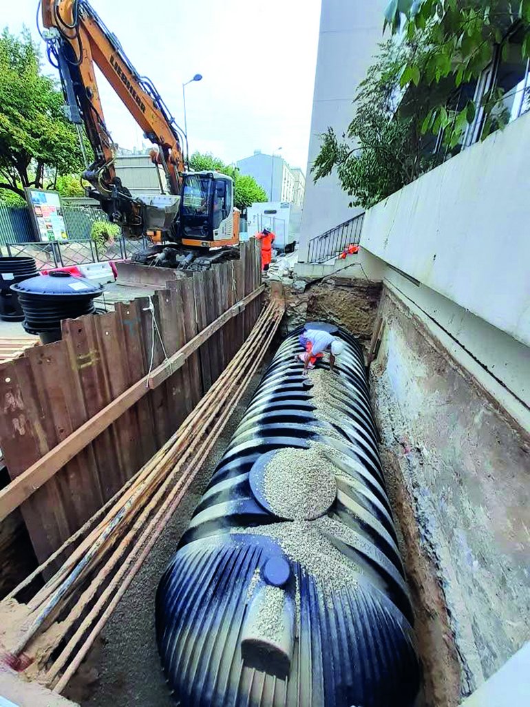 Fin août, une cuve de 30 m3, permettant de récupérer et de stocker l’eau préalablement déchlorée, a été enfouie devant la piscine, rue du Commandant Mouchotte. Des pompes permettront aux balayeuses et laveuses de se ravitailler, le besoin étant d’environ 10 m3 par jour.