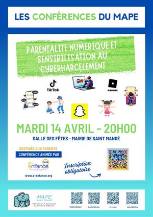 Autant de questions qui pourront trouver leurs réponses lors de la conférence sur la bonne utilisation des outils numériques présentée par l'association d'utilité publique Association e-Enfance, avec le soutien de Ville de Saint-Mandé.